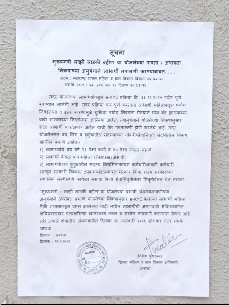 मुख्यमंत्री माझी लाडकी बहीण योजना अधिक पारदर्शक आणि प्रभावी करण्यासाठी शासनाने उचललेले हे पाऊल महत्त्वाचे मानले जात आहे. पात्र महिलांनी घाबरून न जाता आवश्यक कागदपत्रांसह सहकार्य करावे, तर अपात्र लाभार्थ्यांनी चुकीची माहिती दिली असल्यास त्याचे परिणाम भोगण्याची तयारी ठेवावी, असे आवाहन प्रशासनाकडून करण्यात आले आहे.